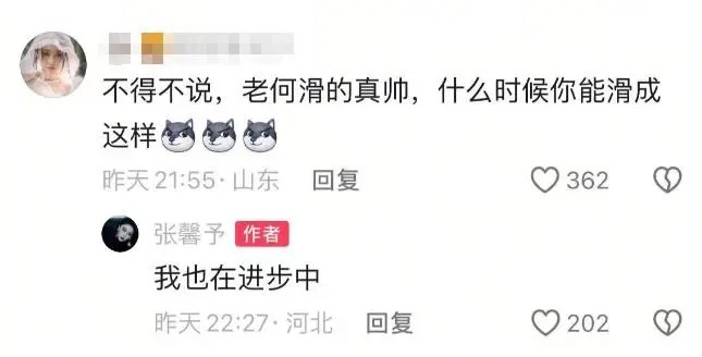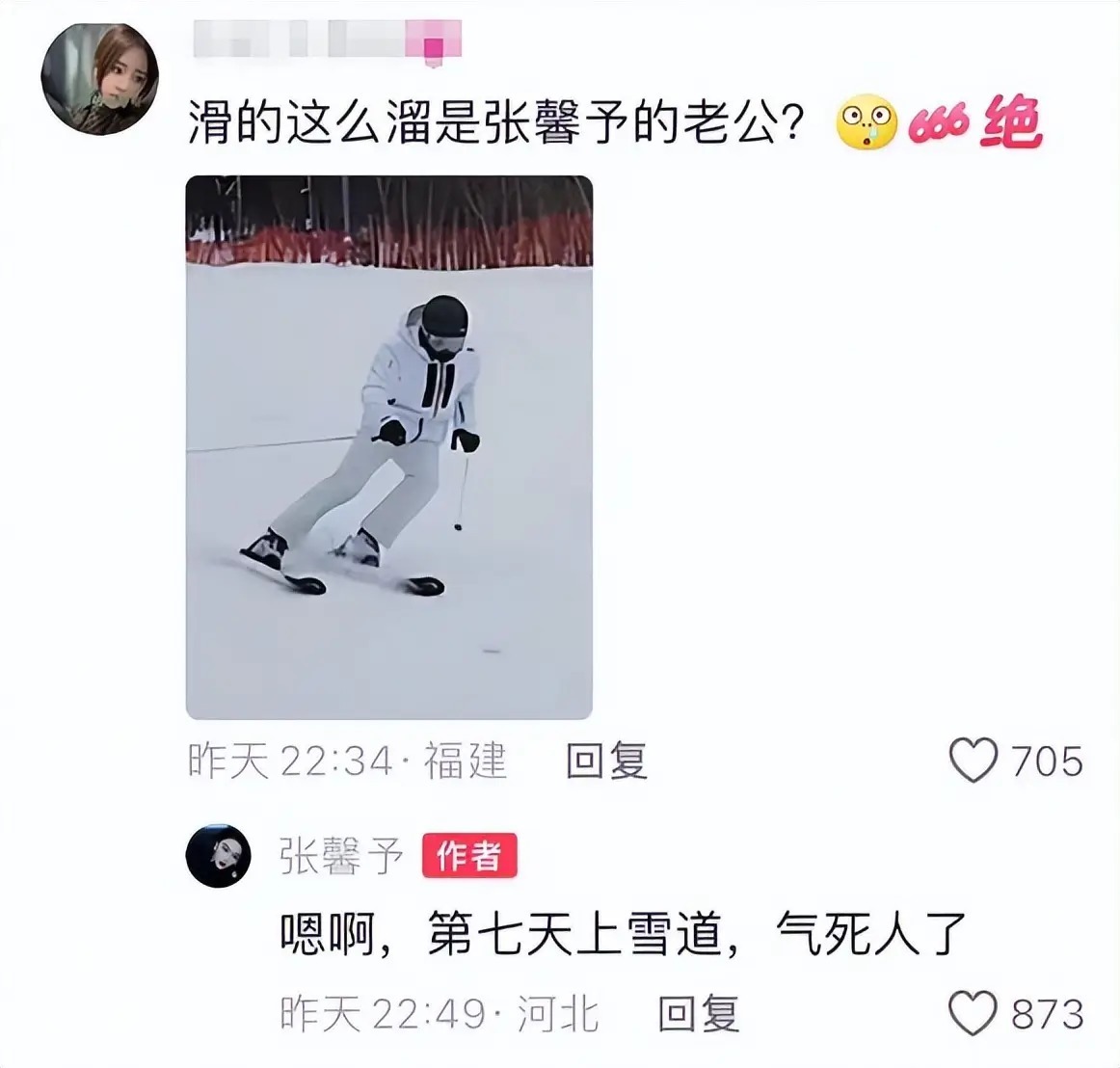 张馨予还回复网友,说老公第七天上雪道,气死人了,网友夸何捷滑的真帅,张馨予说自己也在努力中,只是天赋也很重要,一般人7天可滑不成何捷这样。