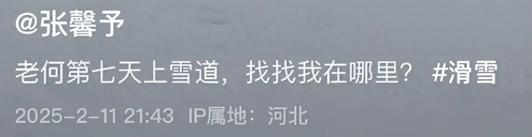 2月11日晚,张馨予更新视频动态,晒出和老公何捷去河北滑雪的视频,她写道:“老何第七天上雪道,找找我在哪里?”直接称呼老公为“老何”,张馨予这幸福的状态也是难以遮掩。