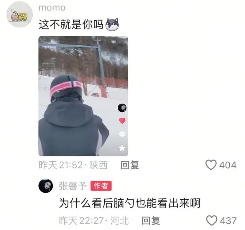 其实这两个都不是张馨予,有少数网友猜对了,张馨予穿着黑色滑雪服只露了个后背,她还反问网友:“为什么看后脑勺也能看出来啊”,有网友调侃她,隔着屏幕都能发现你迷妹一样的看着老何,太好辨别了。
